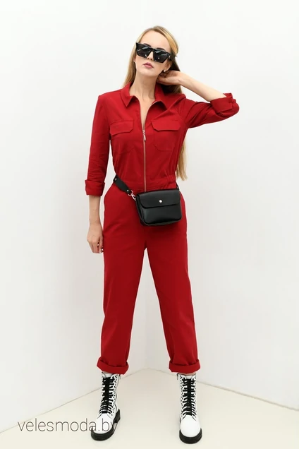 Женский комбинезон свободного силуэта, отрезной по линии талии, со спущенным длинным рукавом на манжете, рубашечным воротником на стойке и застежкой по переду на молнию. В настрочную кулиску на талии вставлена резинка. Брюки комбинезона свободные, прямые, с боковыми карманами "хулиган". Комбинезон выполнен из плотного хлопкового полотна.
