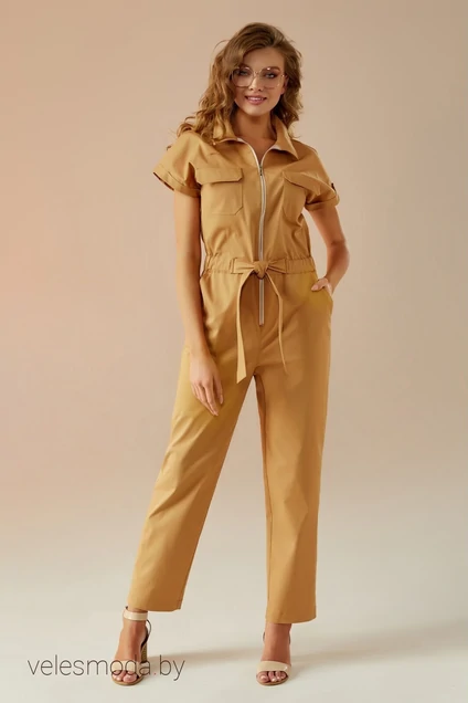 Женский комбинезон свободного силуэта, отрезной по линии талии, со спущенным коротким рукавом, рубашечным воротником на стойке и застежкой по переду на молнию. В настрочную кулиску на талии вставлена резинка. Кулиска переходит в пояс, завязывающийся по переду. Брюки комбинезона свободные, прямые, с боковыми карманами "хулиган". Комбинезон выполнен из плотного хлопкового полотна.