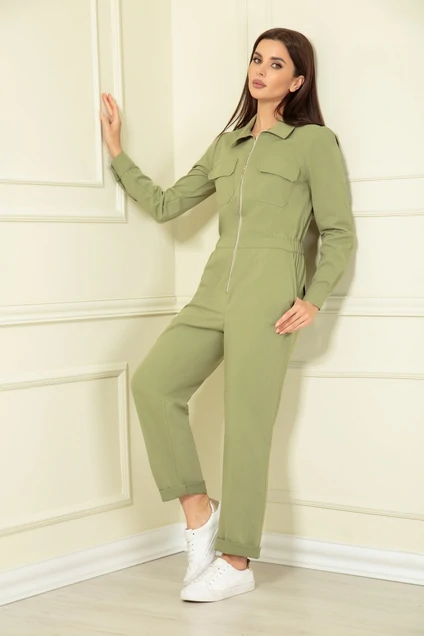Женский комбинезон свободного силуэта, отрезной по линии талии, с втачным длинным рукавом, рубашечным воротником на стойке и застежкой по переду на молнию. В настрочную кулиску на талии вставлена резинка. Брюки комбинезона свободные, прямые, с боковыми карманами "хулиган". Комбинезон выполнен из плотного хлопкового полотна.