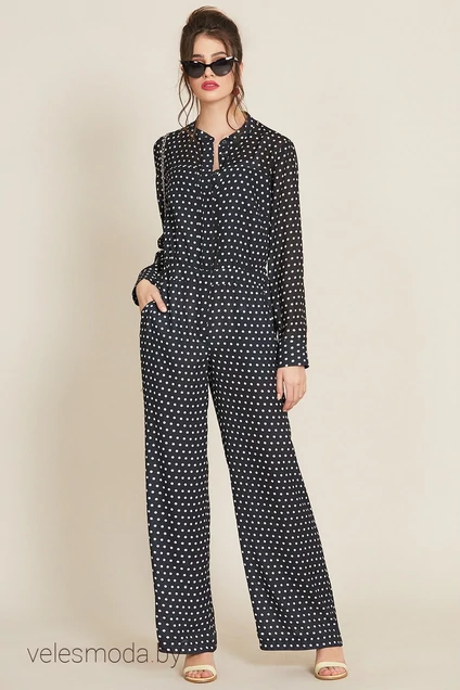 Актуальный в этом сезоне элемент гардероба - комбинезон. Это изделие отлично подчеркнет изящность силуэта, вытянет фигуру и сделает образ женщины грациозным. Красиво и мягко драпируется и струится шифон, из которого выполнена эта модель. Различные фактруры ткани используются в изделии: рукава и кокетка - полупрозрачные, а остальные элементы изделия нет. Отлично выделяет это изделие принт - белый горошек, который всегда в моде. Воротник-стойка. Рукав втачной, одношовный с манжетой, которая застегивается на петли-пуговицы. В боковых швах брюк обработаны карманы. Застежка центральная потайная на петли-пуговицы. Состав ткани : Вискоза: 50%, Полиэстер: 40%, Шелк: 10% Длина по центру спинки : 42см., 42см., 42см. По груди : 48см., 50см., 52см. По бедрам : 50см., 52см., 54см. По талии : 38см., 40см., 42см. Длина рукава : 61см., 61см., 61см. Ширина рукава : 16.5см., 17.5см., 18.5см. Длина юбки/брюки : 106см., 106см., 106см.