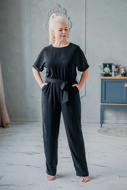 Комбинезон полуприлегающего силуэта с коротким рукавом. Горловина округлая. Перед и спинка отрезные по линии талии, по низу рукава притачная манжета. Застежка по спинки на петлю и пуговицу. Карманы в боковом шве с