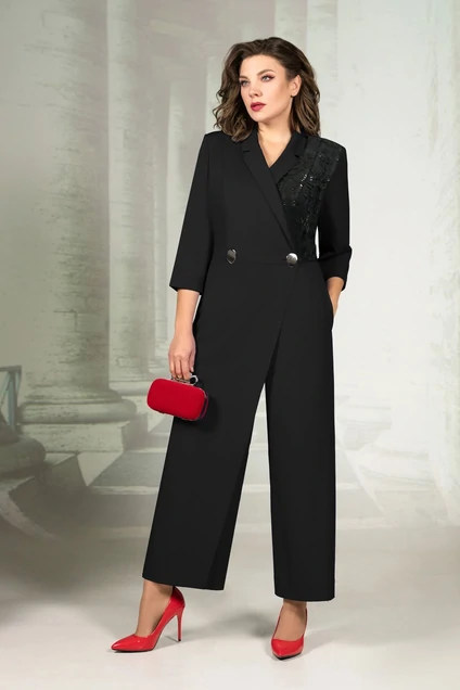 Нарядный комбинезон из костюмно-плательной ткани средней плотности, немного тянется. Застежка на молнию и пуговицы спереди. По спинке на талии резинка. На переде отлетная деталь, имитирующая запАх. Длина 141 см, рукав 49 см.