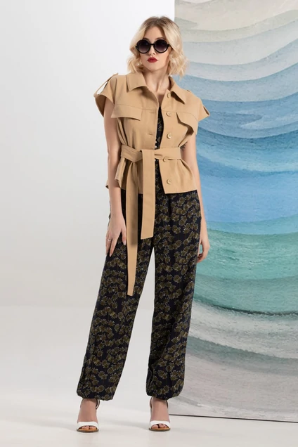 Комплект двойка: комбинезон+жилет. Легкий, удобный комбинезон на бретелях. Застежка на пуговицы спереди. Талия и низ на резинке. Жилет укороченный, без рукавов, из х/б джинса. Застежка на пуговицы, пояс съемный. Длина жилета по спинке 54 см. Ждина жилета 54 см, комбинезона 133 см.