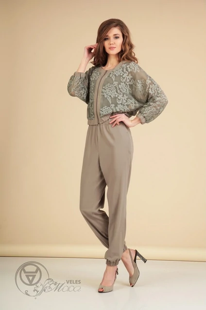 Комплект женский двухпредметный, состоит из комбинезона и бомбера. Комбинезон из костюмно-плательной ткани без рукавов с V-образным вырезом горловины по переду и спинке, на кулисе, с полной длиной брюк. Перед комбинезона с бантовыми складками от плечевых швов. На уровне бёдер в боковых швах обработаны карманы. В среднем шве обработана потайная застёжка-«молния». По низу комбинезон на притачных манжетах, в которые вставлена резинка. Кулиса на талии также на резинке. Спинка комбинезона простая. Бомбер их отделочной ткани с горловиной круглой формы. Застёжка центральная с разъёмной молнией. По переду бомбера вдоль молнии и по горловине вставки из основного материала, по низу притачной пояс на резинке из основного материала. Спинка простая, по горловине вставка из основного материала. Рукав цельнокроенный длиной 7/8. По низу рукавов притачные манжеты на резинке. Длина комбинезона от линии талии 103 см. Длина рукава бомбера 63см. Длина бомбера 45 см. На фото модель рост 175 см.