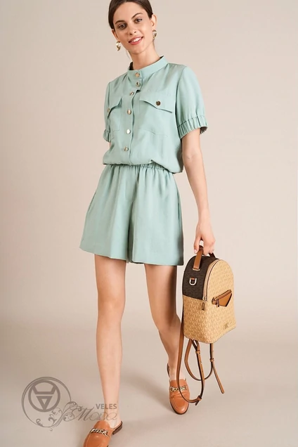 Комбинезон женский из плательной ткани, отрезной по линии талии на широкой резинке. Воротник пиджачного типа. Рукав втачной, одношовный на широкой резинке. Застежка петля пуговица в верхней части изделия. По переду настрочены карманы.