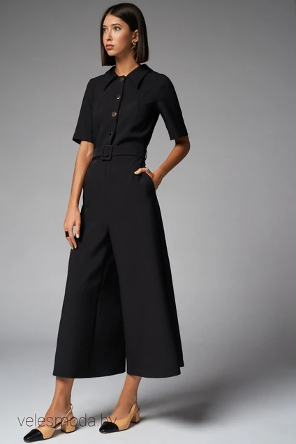 Комбинезон женский из плательной ткани, отрезной по линии талии. Воротник рубашечного типа. Рукав втачной, одношовный . Застежка петля пуговица в верхней части изделия. Низ брюк кюлоты.