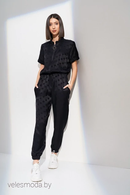Комбинезон женский из плательной ткани, отрезной по линии талии, на резинке. Воротник стойка, застежка центральная - тесьма молния. Рукав короткий, втачной, одношовный, низ рукава на резинке. Брюки комбинезона заужены книзу на резинке. В боковых швах брюк - карманы. Длина изделия 145 см.