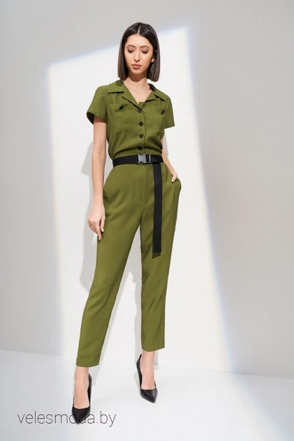 Комбинезон женский из плательной ткани отрезной по линии талии на поясе. По спинке изделия пояс на резинке. Воротник рубашечного типа. Рукав втачной короткий. Застежка центральная петли пуговицы, молния в брюках изделия. По переду нашиты карманы. В боковых швах брюк - карманы. В комплекте пояс. Длина изделия 143 см.