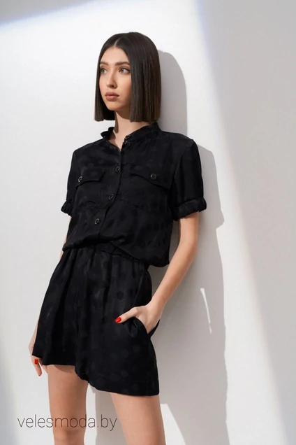 Комбинезон женский из плательной ткани, отрезной по линии талии, на резинке. Воротник стойка, застежка центральная - петли - пуговицы Рукав короткий, втачной, одношовный, низ рукава на резинке. Шорты комбинезона свободного кроя. В боковых швах - карманы. Длина изделия 94 см, длина рукава 21.