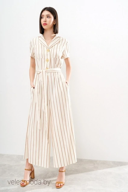 Комбинезон женский из плательной ткани, отрезной по линии талии. Воротник рубашечного типа, застежка центральная петли пуговички, в брюках молния. Рукав короткий, втачной, одношовный. По переду нашиты карманы. Брюки комбинезона свободного кроя, в боковых швах карманы. По линии талии нашиты шлевки. В комплекте пояс.