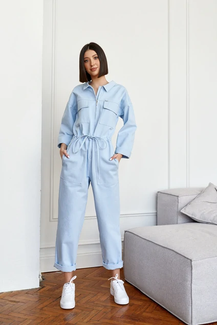 Комбинезон женский выполнен из хлопковой джинсовой ткани. Комбинезон прямого кроя, отрезной по линии талии, с рукавом со спущенным плечом. Воротник рубашечного типа. Застежка - молния по переду изделия. По линии талии кулиска. По переду, в области груди, нашиты карманы. В нижней части изделия нашиты функциональные карманы.
