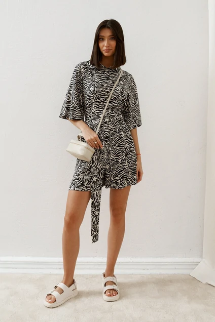 Комбинезон выполнен из легкого вискозного полотна с анималистическим принтом. Стильный летний комбинезон, идеальный вариант на каждый день, встречи, прогулки.