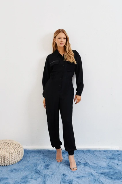 Комбинезон выполнен из полотна черного цвета. Комбинезон - яркий стильный образ, подойдет под низкий ход, высокий каблук, ботинки. Характеристики: полуприлегающий силуэт, отрезной, отложной воротник, застежка центральная на планке на петли пуговицы, рукав втачной по низу рукава манжета на пуговичке, по переду крупные карманы с клапаном, по лини талии резинка, по заднему полотну имитация карманов с клапанами. Клапаны карманов украшены мелкими стразами. Низ брюк в изделии заканчивается резинкой. Длина по спинке 149, длина рукава 80 от края горловины.