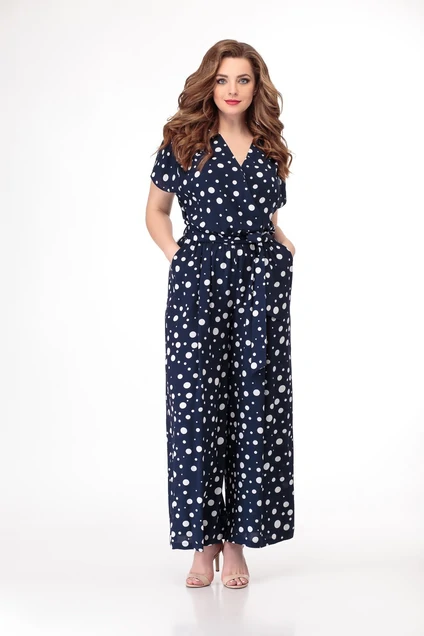 Комбинезон женский, полуприлегающего силуэта, с имитацией запаха, декоративными складками в плачевых швах и втачным рукавом полуреглан, по спинке с застёжкой на потайную тесьму молнию. Комбинезон отрезной ниже линии талии с напуском, брюки свободные с боковыми карманами и складками, по шву притачивания верхней части к брюкам вставлена эластичная тесьма. Комбинезон классической длины, дополнением идёт съёмный пояс.
