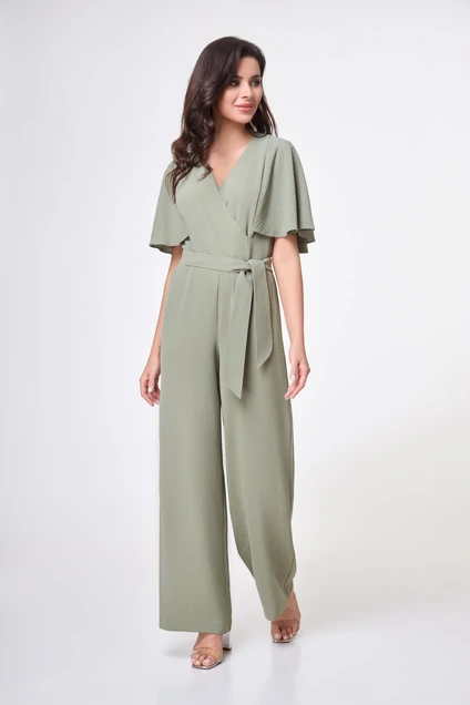 Комбинезон женский прилегающего силуэта, с имитацией запаха, с декоративными руками-крылышками вставленными в рельефные швы в верхней части комбинезона, по спинке с застёжкой на потайную тесьму молнию. Комбинезон отрезной по линии талии, брюки свободные с боковыми карманами и вытачками на задней половине брюк. Комбинезон классической длины, дополнением идёт съёмный пояс.