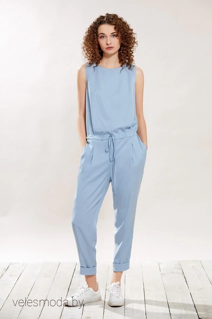 Комбинезон без рукавов с напуском, отрезной по талии, спереди с кулисой, сзади с резинкой и настрочными карманами по нижней части. Полочка со средним швом и складками. Нижняя часть с карманами и складками. Спинка с вырезом до талии и застёжкой на петлю-пуговицу вверху