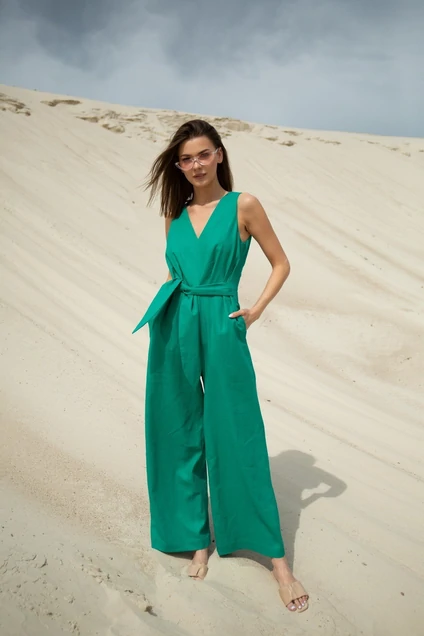 Комбинезон женский, без рукавов, с V-образным вырезом горловины по полочке и спинке. Отрезной по талии. Полочка в верхней части со складкой, с карманами и завязками в боковых швах. Спинка с таливыеми выточками.
