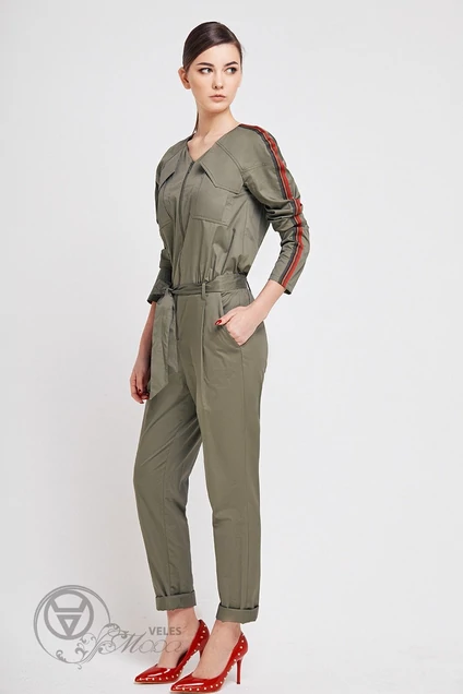 Комбинезон брючный прямого силуэта, отрезной по линии талии на резинке, сосъёмным поясом и боковыми подрезными карманами. По переду накладные нагрудные карманы с клапанами и застёжками на молнии. По спинке кокетка. Рукав реглан двухшовный, отрезной в врхней части с настрочной тесьмой.