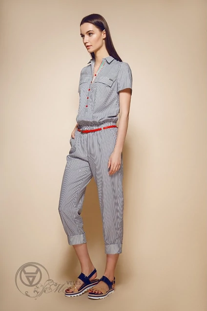 Комбинезон полуприлегающего силуэта, отрезной по талии, на широкой резинке. Верх комбинезона с вытачкой, накладными карманами и клапанами, с застёжкой на петле-пуговице на планке. Спинка с кокеткой и складкой. Рукав втачной короткий, с манжетой и патой. Воротник отложной на стойке. Нижняя часть комбинезона с карманами в боковых швах. По низу паты. Длина по спинке 151 см. Длина рукава 19 см.