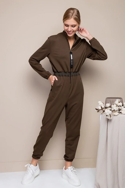Комбинезон из однотонного трикотажа в комбинации с отделочным трикотажем по линии талии. Высокий ворот, резинка на талии, подчеркивающая фигуру, глубокие карманы в районе бедер. Дизайнерские элементы: черная металлическая молния с декоративной лентой по бегунку и фирменная нашивка "DALORIA" вдоль левого кармана на бедре. Уход: стирка при температуре не выше 30°C. Утюжить при температуре на выше 110°C.