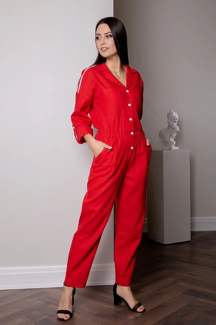 Комбинезон льняной, отрезной по талии, с отложным воротником. Пройма спущена, рукав втачной, длиной 3/4. Низ рукава обработан манжетой, рукава с патами. По переду изделия, на груди, - накладные карманы. Застежка цельнокроеная, планка с кнопками. По плечевым и боковым швам - настрочная декоративная тесьма. На спинке комбинезона - авторская печать. В талии - резинка. По переду брюк комбинезона - складки и карманы.