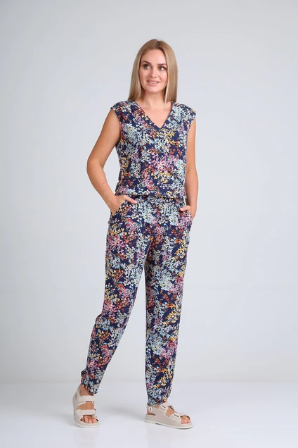 Яркий лёгкий комбинезон из штапеля весьма актуален в новом сезоне наступающего лета. Горловина V-образная, обработана обтачкой с отделочной строчкой, по спинке застежка на навесные петли с пуговицами. В верхней части переда отрезные кокетки с небольшой сборкой. Линия плеча слегка приспущена. Талия отрезная, присборена на эластичную тесьму-резинку по всей длине. Нижняя часть выполнена в виде брюк свободного прямого силуэта, к низу брюки слегка заужены , задняя часть бирючины частично присобрана на резинку. От боковых швов по переду расположены наклонные внутренние карманы с отделочной строчкой. Отличный вариант для солнечных дней.