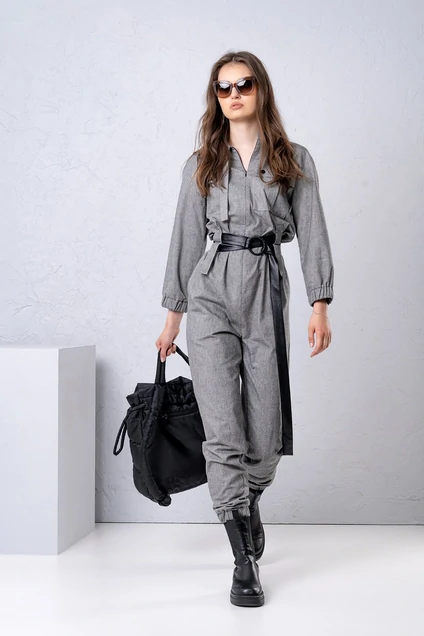 Комбинезон женский из мягкой джинсовой ткани с застежкой на потайную молнию по переду. Вырез горловины - оформлен воротником стойкой, переходящим в отделочную деталь. На левой полочке в области груди накладной карман с клапаном. Рукава - со спущенной линией плеча, по низу манжет на резинке. На спинке кокетка и небольшие складки по линии талии. Брюки- свободные, зауженные к низу с манжетом на резинке. В боковых швах имеются фигурные карманы с декоративной отделкой. В области линии талии- декоративные паты. Изделие дополнено съемным поясом. Длина брюк по боковому шву-105 см. Длина рукава от линии горловины-64 см.
