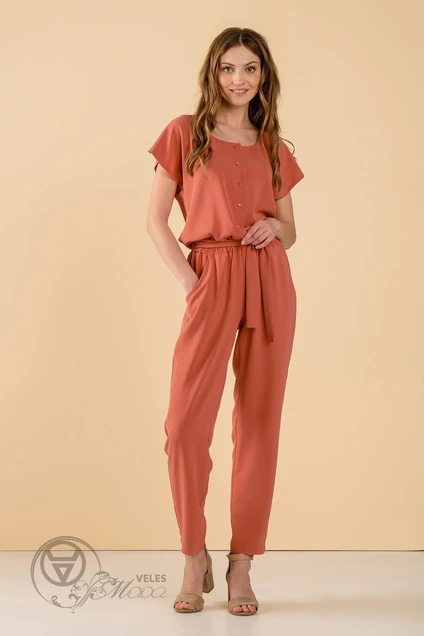 Комбинезон женский из тонкой плательной ткани свободного покроя зауженный к низу. По бокам в области линии талии имеются карманы с отрезным бочком. По полочке выполнена однобортная застежка на петли с пуговицами. Вырез горловины неглубокий, округлой формы. Линия плеча - приспущенная, без рукава. В области талии подрез с резинкой. Изделие дополнено съемным поясом из отделочной эластичной тесьмы с декоративной пряжкой. Вся фурнитура с золотым покрытием. Длина по боковому шву 104 см, длина спинки 52 см.