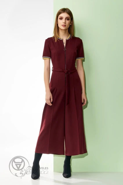Комбинезон полуприлегающего силуэта с поясом на полукольцах. Выполнен из тонкой плательно-костюмной ткани. По переду рельефы, переходящие в мягкие складки. Рукав короткий. По переду молния. Отделочный элемент — тесьма-резинка по горловине и манжет рукава. Длина от талии - 82 см.