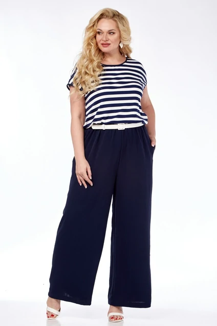 Комбинезон женский( вполнен из двух видов ткани) свободного кроя с застежкой на 1 навесную петлю и пуговицу на горловине спинки.Лиф из трикотажа в полоску с запахом на спинке. Горловина округлой формы. Нижняя часть комбинезона с притачным поясом и резинкой. В боковых швах обработаны карманы. Длина до талии 48 см, длина брюк по боку 106 см