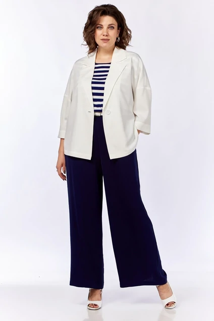 Комплект женский состоит из комбинезона и жакета. Комбинезон свободного кроя с застежкой на поясную петлю и пуговицу и на спинке, и спереди. Верхняя часть с нагрудными вытачками. Нижняя часть с боковыми карманами в швах. В области талии резинка. Жакет свободного кроя с застежкой на петлю и пуговицу. Рукав одношовный со спущенной линией плеча. Воротник пиджачного типа.Пояс в комплекте. Комбинезон: вискоза 50%, хлопок 50%. Длина жакета по спинке 60 см.,длина рукава 29 см. Длина комбинезона до талии 48 см, по боку 106 см.