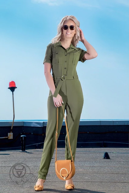 Комбинезон женский свободный. Перед лифа с нагрудными вытачками; планкой, застегивающейся на 6 прорезных петель и пуговиц; накладными карманами с бантовой застроченной складкой. Спинка лифа со средним швом. К лифу притачан отрезной притачной пояс со шлевками сквозь которые продевается пояс из основной ткани застегивающийся на 2 полукольца. Передняя половинка брюк комбинезона с боковыми карманами с отделочной строчкой, закрепляющей мешковину; с имитацией (обманкой) застежки. Задняя половинка брюк с накладными карманами с отрезной деталью. Рукава втачные с отложными цельнокроеными манжетами. Воротник стояче-отложной с цельнокроеной стойкой и отрезной планкой по отлету с фигурным краем, застегивающийся на 1 прорезную петлю и пуговицу. Длина рукава20,5см Длина спинки до верхнего шва пояса 44,5см Длина брюк по боку от верхнего шва пояса 110см