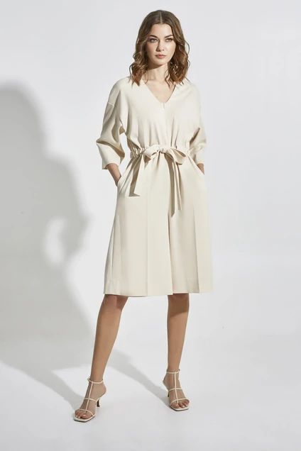 Комбинезон женский, нарядный, приталенного силуэта, по талии с настрочной планкой под пояс, из текстильной ткани. Перед с застежкой на тесьму потайную молнию. Вырез горловины V-образной формы, обработан обтачкой. Рукав со спущенной линией плеча. длина рукава от горловины - 54 см, длина от плечадо талии - 44 см, длина от талии до низа - 63см