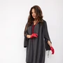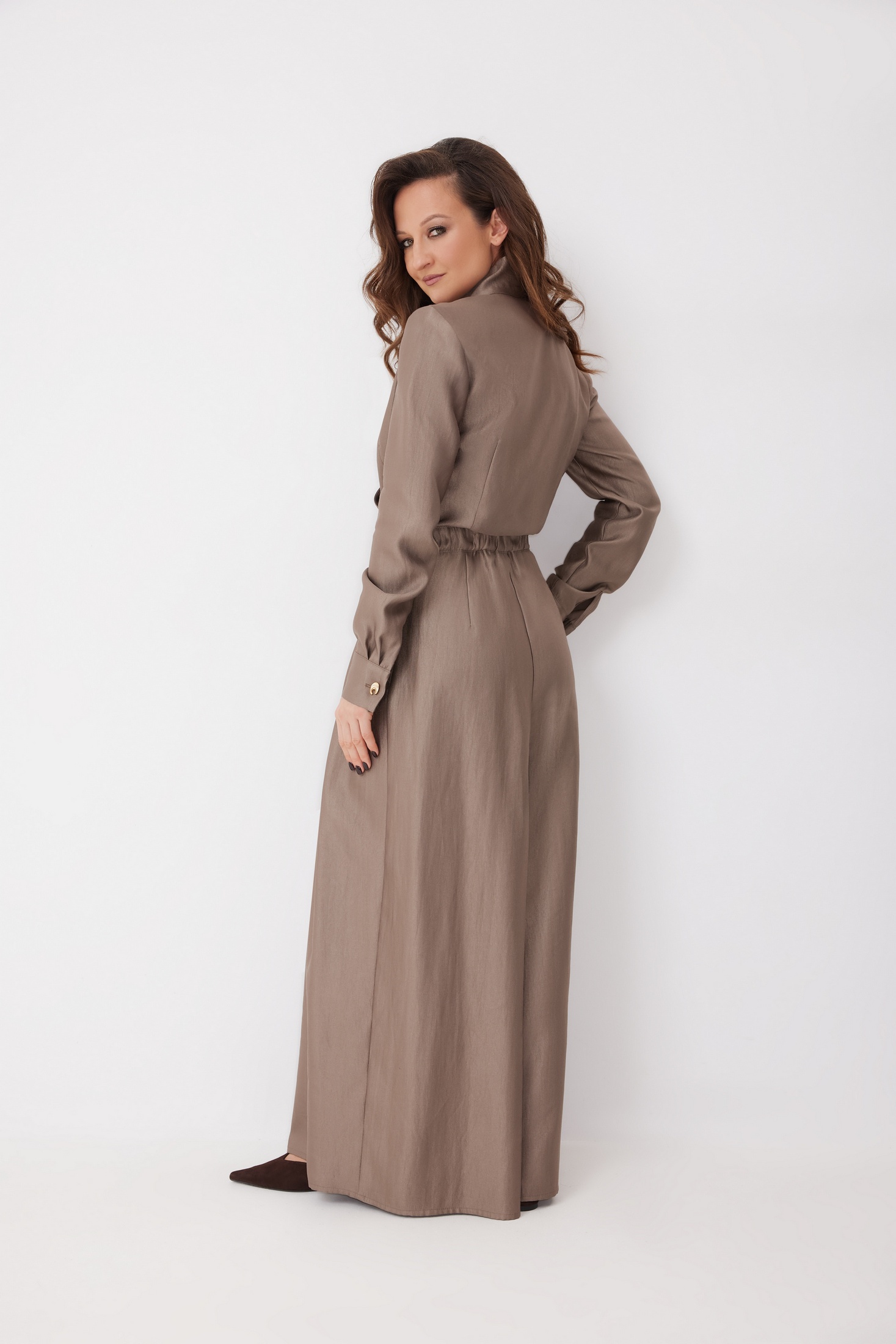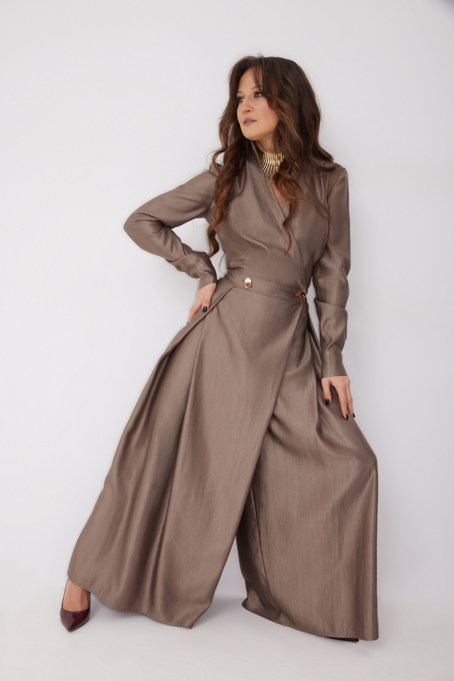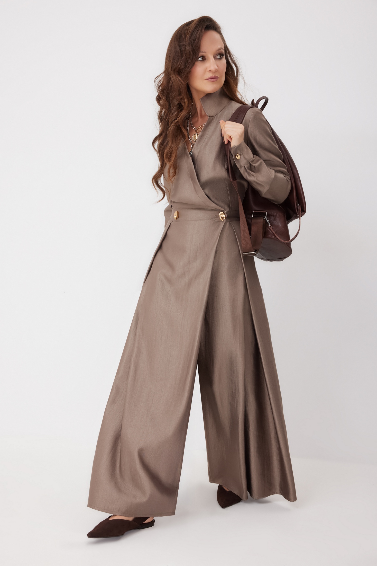Комбинезон женский, отрезной по линии талии. Верхняя часть с рельефами по переду и вытачками по спинке. Воротник стояче-отложной. Застёжка на запах, на петли, пуговицы и потайную магнитную кнопку. Рукав втачной длинный, заканчивается манжетой с застежкой на петли-пуговицы. Нижняя часть комбинезона со складками и имитацией запаха. В боковых швах карманы. По спинке резинка на уровне талии.