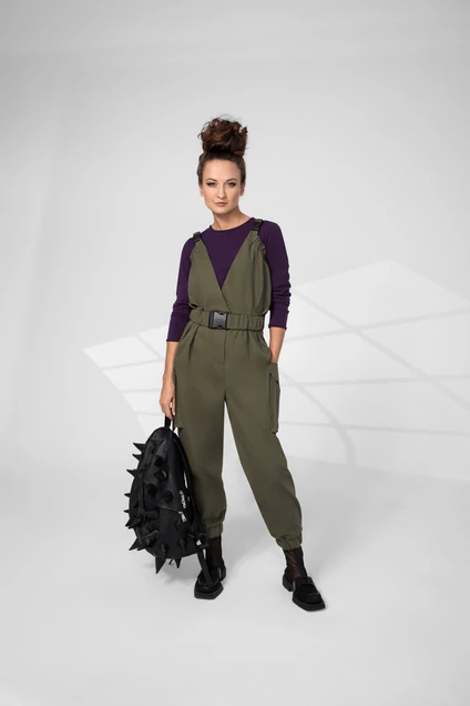 Комплект женский, состоящий из комбинезона и джемпера. Джемпер прямого силуэта, с втачным рукавом. Горловина и низ рукава обработаны планкой с открытым срезом. Комбинезон, отрезной по линии талии, со складками по переду. Верхняя часть комбинезона обработана планкой с резинкой. Комбинезон на бретелях с фастексами, что позволяет регулировать высоту посадки. По бокам нижней части накладные карманы "портфели". Застёжка на тесьму-молнию. Низ комбинезона обработан манжетой с резинкой. В комплекте пояс на резинке.