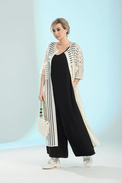 Комплект женский состоящий из комбинезона и шазюбля. Комбинезон прямого силуэта, с V-образным вырезом по переду и спинке. Застежка по спинке на петли и пуговицы с "капелькой". Длину изделия, в зависимости от роста, можно регулировать кулисой в плечевом шве. В боковых швах карманы. Шазюбль прямого силуэта, со спущенной линией плеча. По переду застёжка на петли и пуговицы на планке. Перед с кокетками и накладными карманами. Спинка с кокеткой. Рукав втачной короткий. В боковых швах высокие разрезы. Вырез горловины круглый. рубашка: пэ 70%, вискоза 26%, эластан 4%