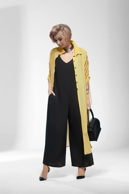 Комплект женский, состоящий из шазюбля и комбинезона. Шазюбль прямого силуэта, с центральной застежкой на петли и пуговицы на планке. Воротник рубашечного типа. Рукав втачной, длиной 3/4,с кулисами, что позволяет регулировать длину. Для придания летящего образа в боковых швах шазюбля высокие разрезы. Комбинезон прямого силуэта, с V-образным вырезом по переду и спинке. Застежка по спинке на петли и пуговицы с "капелькой". Длину изделия, в зависимости от роста, можно регулировать кулисой в плечевом шве. В боковых швах карманы.