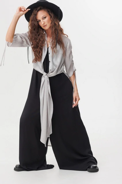 Комплект женский, состоящий из шазюбля и комбинезона. Шазюбль прямого силуэта, с центральной застежкой на петли и пуговицы на планке. Воротник рубашечного типа. Рукав втачной, длиной 3/4,с кулисами, что позволяет регулировать длину. Для придания летящего образа в боковых швах шазюбля высокие разрезы. Комбинезон прямого силуэта, с V-образным вырезом по переду и спинке. Застежка по спинке на петли и пуговицы с "капелькой". Длину изделия, в зависимости от роста, можно регулировать кулисой в плечевом шве. В боковых швах карманы.