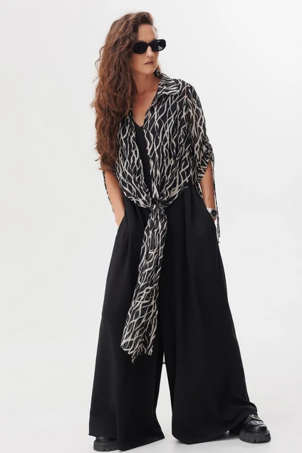 Комплект женский, состоящий из шазюбля и комбинезона. Шазюбль прямого силуэта, с центральной застежкой на петли и пуговицы на планке. Воротник рубашечного типа. Рукав втачной, длиной 3/4,с кулисами, что позволяет регулировать длину. Для придания летящего образа в боковых швах шазюбля высокие разрезы. Комбинезон прямого силуэта, с V-образным вырезом по переду и спинке. Застежка по спинке на петли и пуговицы с "капелькой". Длину изделия, в зависимости от роста, можно регулировать кулисой в плечевом шве. В боковых швах карманы.
