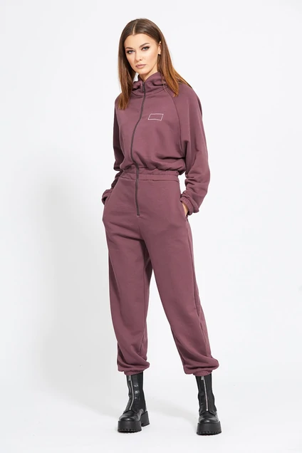 Комбинезон выполнен из однотонного плотного трикотажного полотна. Комбинезон отрезной по линии талии. Застежка спереди на молнию. Горловина округлой формы, обработана капюшоном. Рукав покроя реглан, одношовный, на манжете с эластичной тесьмой. Спинка цельная. Пояс втачной, с эластичной тесьмой. Низ комбинезона выполнен в виде брюк. Брюки свободного покроя, на манжете с эластичной тесьмой. Спереди боковые карманы с наклонным входом. Комбинезон декорирован вышивкой по переду и спинке.