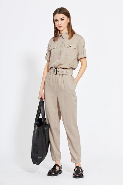 Комбинезон выполнен из однотонной ткани. Затежка спереди на пуговицы. По лифу накладные карманы, воротник рубашечного типа, рукав втачной с декоративной патой. Комбинезон притален широкой резинкой в кулиске со шлевками под пояс, в боковых швах - карманы. Съемный пояс из основной ткани идет в комплекте.