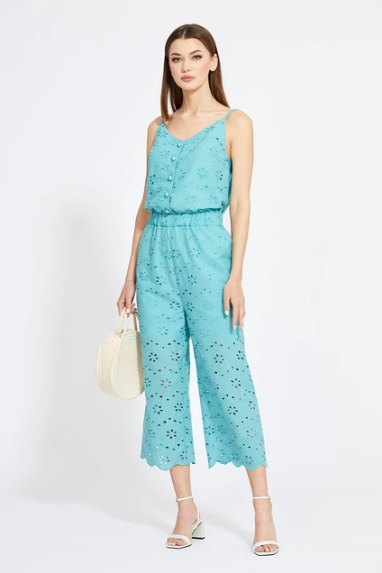 Комбинезон выполнен из ткани с вышивкой "ришелье". Комбинезон полуприлегающего силуэта, отрезной по линии талии, длиной 7/8. Затежка спереди на пуговицы. Спинка цельная. Перед лифа на подкладке. Лиф на регулируемых бретелях. Комбинезон притален поясом с эластичной тесьмой. В боковых швах - карманы. Брюки комбинезона на подкладке длиной до середины бедра. Низ брюк комбинезона с фестонами.