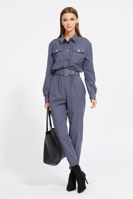 Комбинезон выполнен из однотонной ткани. Затежка спереди на пуговицы. По лифу накладные карманы, воротник рубашечного типа, рукав втачной. Внутри рукава пришита пата, дающая возможность укоротить рукав. Комбинезон притален широкой резинкой в кулиске со шлевками под пояс, в боковых швах - карманы. Съемный пояс из основной ткани идет в комплекте.