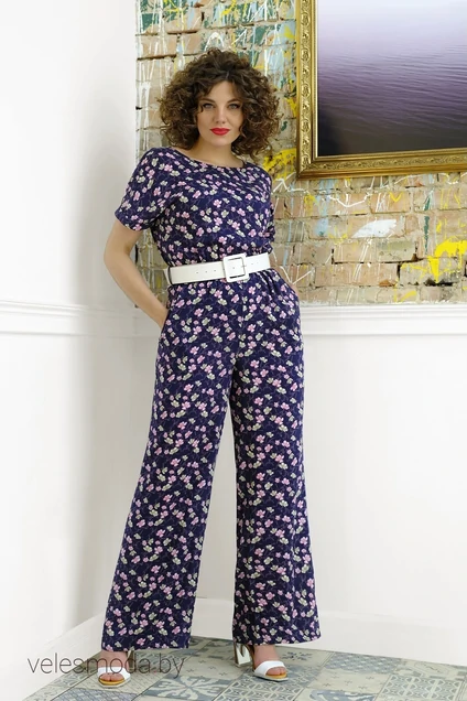 Легкий удобный комбинезон из плательно-блузочной х/б ткани. Ткань не просвечивает. Застежка на молнию в среднем шве спинки. В боковых швах карманы. На талии резинка. Длина изделия измерялась по среднему шву спинки от горловины. Ремень входит в комплект. Длина 156 см.