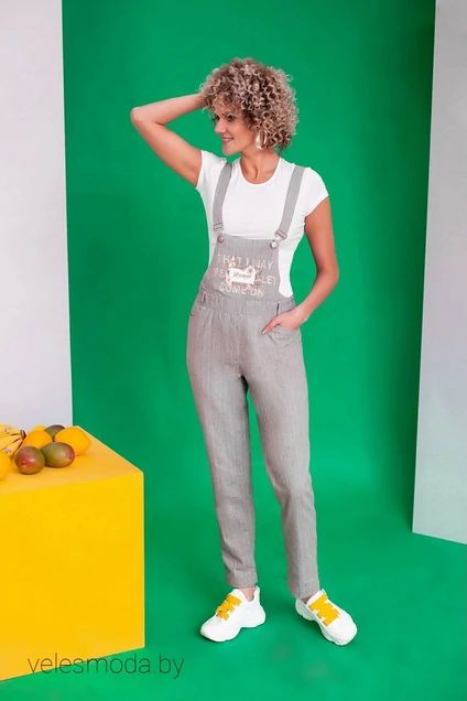 Полукомбинезон брючный женский из хлопковой ткани. По переду расположены карманы с полукруглым входом. Пояс притачной со шлевками и резинкой. На груди и накладном заднем кармане нанесен принт-термонаклейка. Внутренняя часть пояса и деталь верха, обработана подкладочной тканью, контрастного цвета. Высота посадки и длина шлеек регулируется при помощи металлической застежки и джинсовой пуговицы. По задним половинкам брюк выполнены накладные карманы и талиевые выточки, обеспечивающие комфортное прилегание. Длина изделия по боку - 98 см.