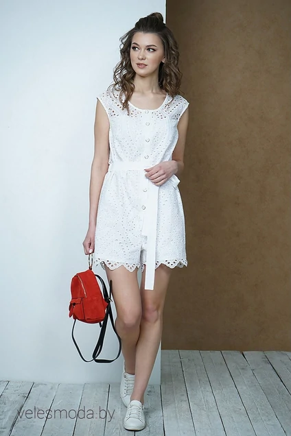 Последние несколько лет комбинезоны просто ворвались в нашу жизнь. Эта вещь универсальная, подходит и к праздничному образу и к повседневному. Комбинезон состоит из легкого верха и коротких шорт, который шьется из хлопка. Такая ткань очень легкая. Она пропускает воздух, и даже в жаркую погоду Вам будет комфортно в подобном наряде. Комбинезон с глубоким овальным вырезом горловины, центральной застежкой на петли и пуговицы. Линия талии по спинке фиксируется эластичной лентой, по переду пояс, завязывающийся на мягкий бант. Комбинезон без рукавов, линия плеча слегка спущена. Оригинальность модели придает хлопковая ажурная ткань вышитая в технике "ришелье". Длина комбинезона по спинке ок.85 см.