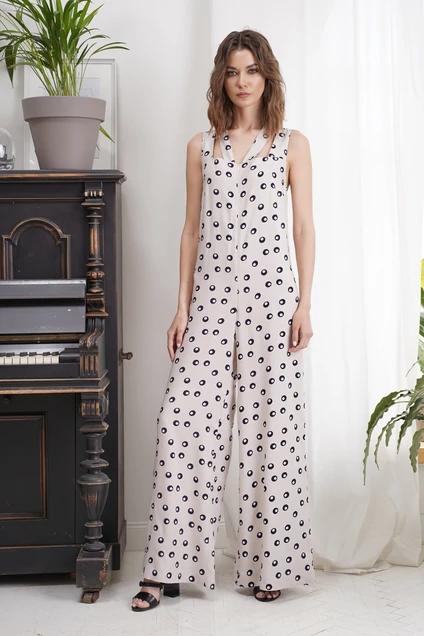 Комбинезон.... Как обойтись летом без этого трендового предмета гардероба? Это превосходная основа для любого образа, которая не требует дополнительных элементов для создания гармонии в образе, ведь комбинезон - самодостаточный и полноценный варианты для любого лука. Легкая, практически невесомая вискоза, лаконичный крой, акцент в области декольте. Нижняя часть комбинезоны юбка-брюки, застежка центральная на потайную молнию. Длина комбинезоны около 150 см.