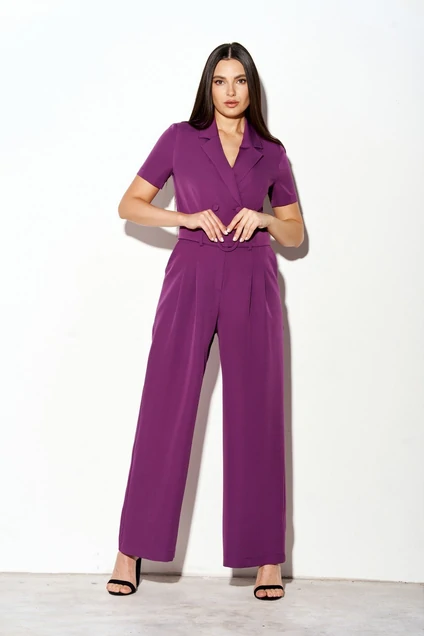 Комбинезон женский полуприлегающего силуэта со втачными рукавами, пиджачным воротником и мягкими складками по переду застегивается на молнию, петли и пуговицы; в боковых швах карманы.