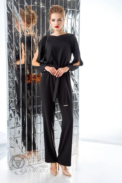 Комбинезон из мягкой костюмно-плательной ткани, с длинным рукавом на манжете, по центру рукава элегантный разрез . По талии резинка, спинка с запахом из двух частей. Застежка на две красивые металлические пуговицы по плечам. По талии пояс с наконечниками в тон пуговиц. Для фиксации выреза по спинке закреплена окантовка. Длина брюк по боковому шву-103см. Длина рукава с манжетой- 63см