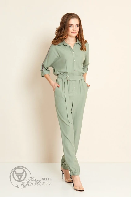Комбинезон полуприлегающего силуэта с прямыми брюками, присобраными по низу на резинку и цельнокроеным рукавом. По переду отрезная линия талии, центральная застёжка с петлями и пуговицами и рубашечный воротник с отрезной стойкой. Плечевой шов Перенесён на полочку и украшен декоративной тесьмой. По низу рукава притачная манжета с патой и пуговицей. Талиевый шов присобран на резинку, настрочены шлёвки с полукольцами. В шлёвки продевается съёмный пояс из ткани. В боковых швах расположены карманы. Спинка отрезная по линии талии, со средним швом. В талиевый шов вставлена резинка, настрочены шлёвки. Длина брюк 104см, длина рукава 46см.